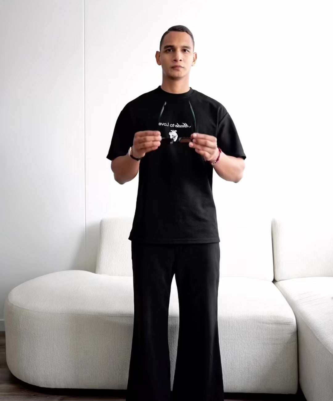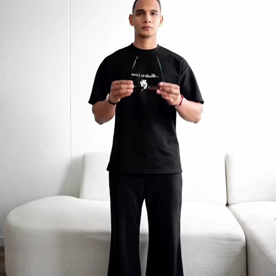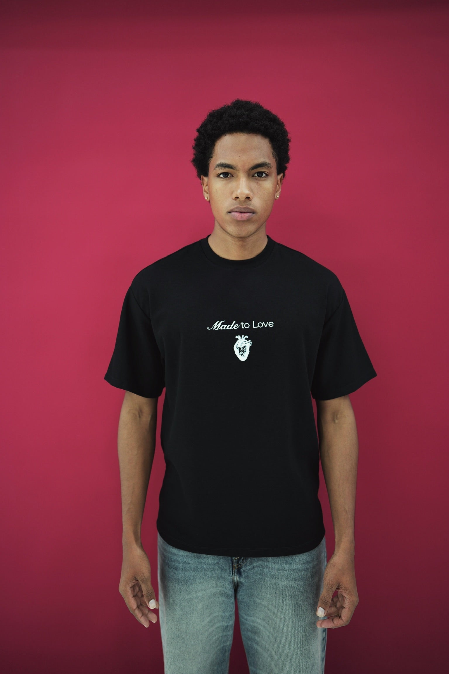 Camiseta manga corta horma Oversized, es unisex con un gramaje de 250g, es elaborada en 100% algodon con una textura suave al tacto. Lleva un estampado en la espalda con una medida de 40cm de alto y en la parte frontal lleva la frase Made to Love bordada.